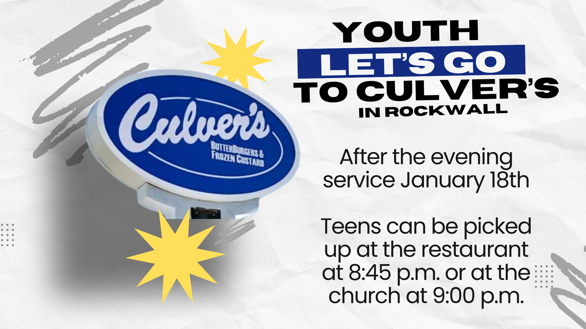Our January Youth "Let's Go" event will be on Sunday, January 18th, after the evening service. Families are welcome to join. Teens can be picked up at the restaurant at 8:45 or at the church at 9pm.