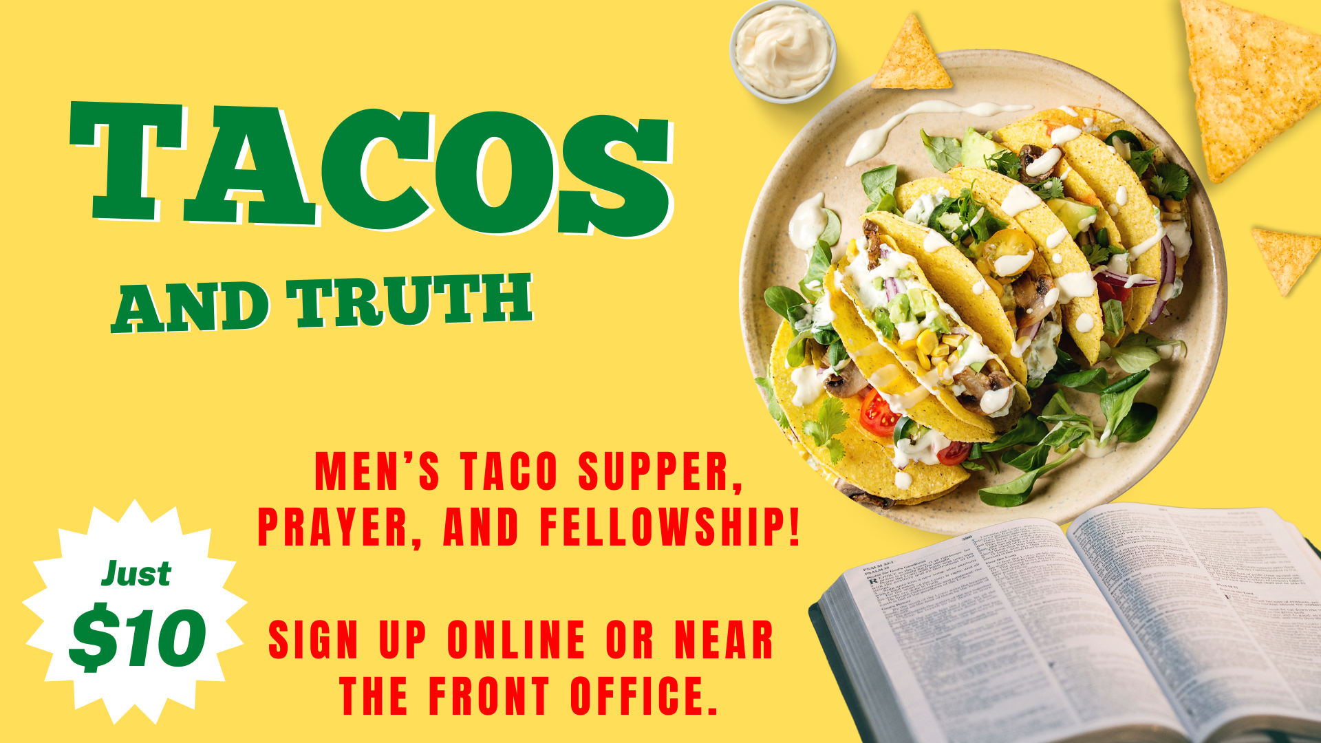 Our men will meet on Saturday, February 28th, at 5pm for Tacos & Truth. Join us for a taco dinner, fellowship, and time in God's Word.