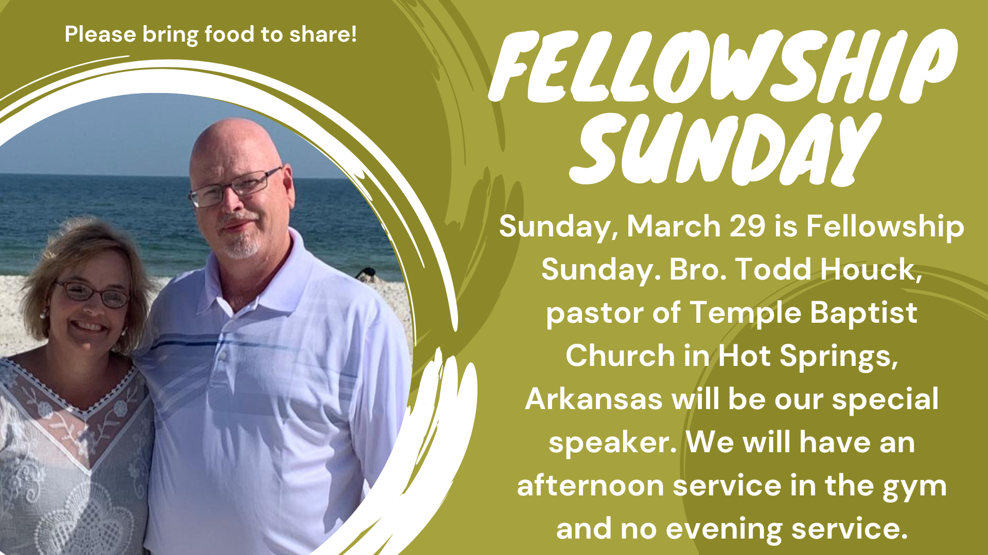 Sunday, March 29, is Fellowship Sunday. Bro. Todd Houck of Temple Baptist Church in Hot Springs, Arkansas, will be our guest speaker. |
