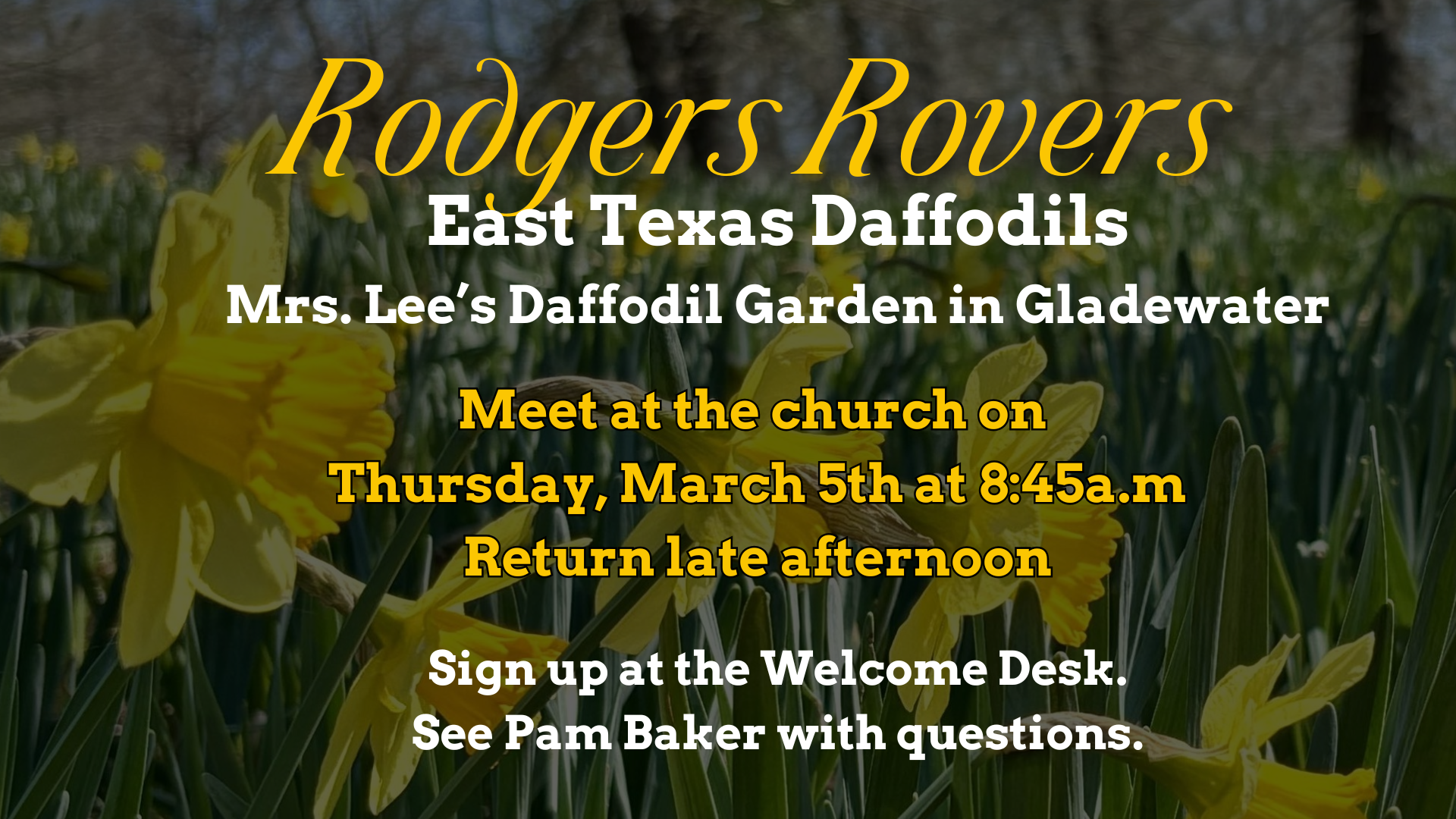 1 event,On Thursday, April 9th, the Rodgers Rovers will go to the Antique Car and Toy Museum in Ft. Worth. They will leave the church at 8:45 and return after lunch. The museum is free, but make sure to bring money for lunch. See Pam Baker to sign up. |