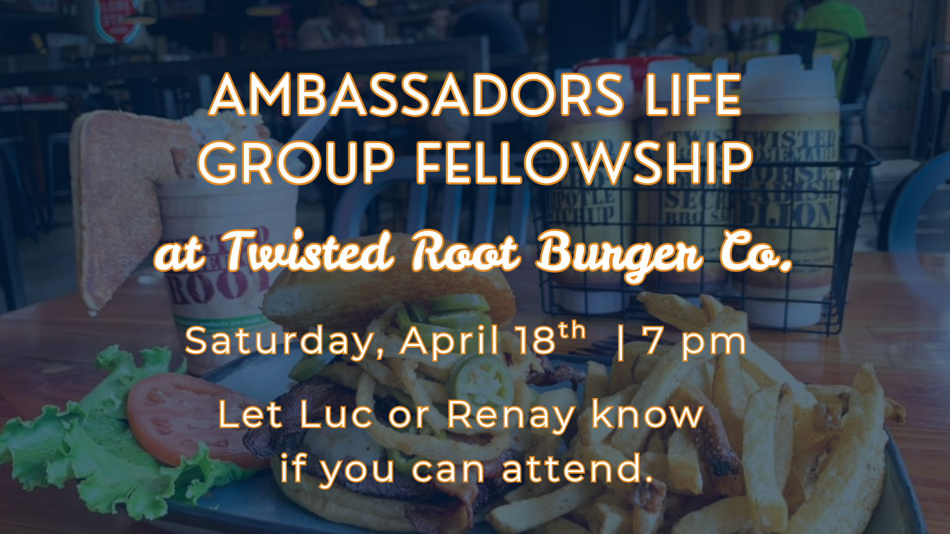 The Ambassadors LIFE Group will be going to Twisted Root Burger Co. on Saturday, April 18th, at 7pm. Let them know if you're planning on making it. |