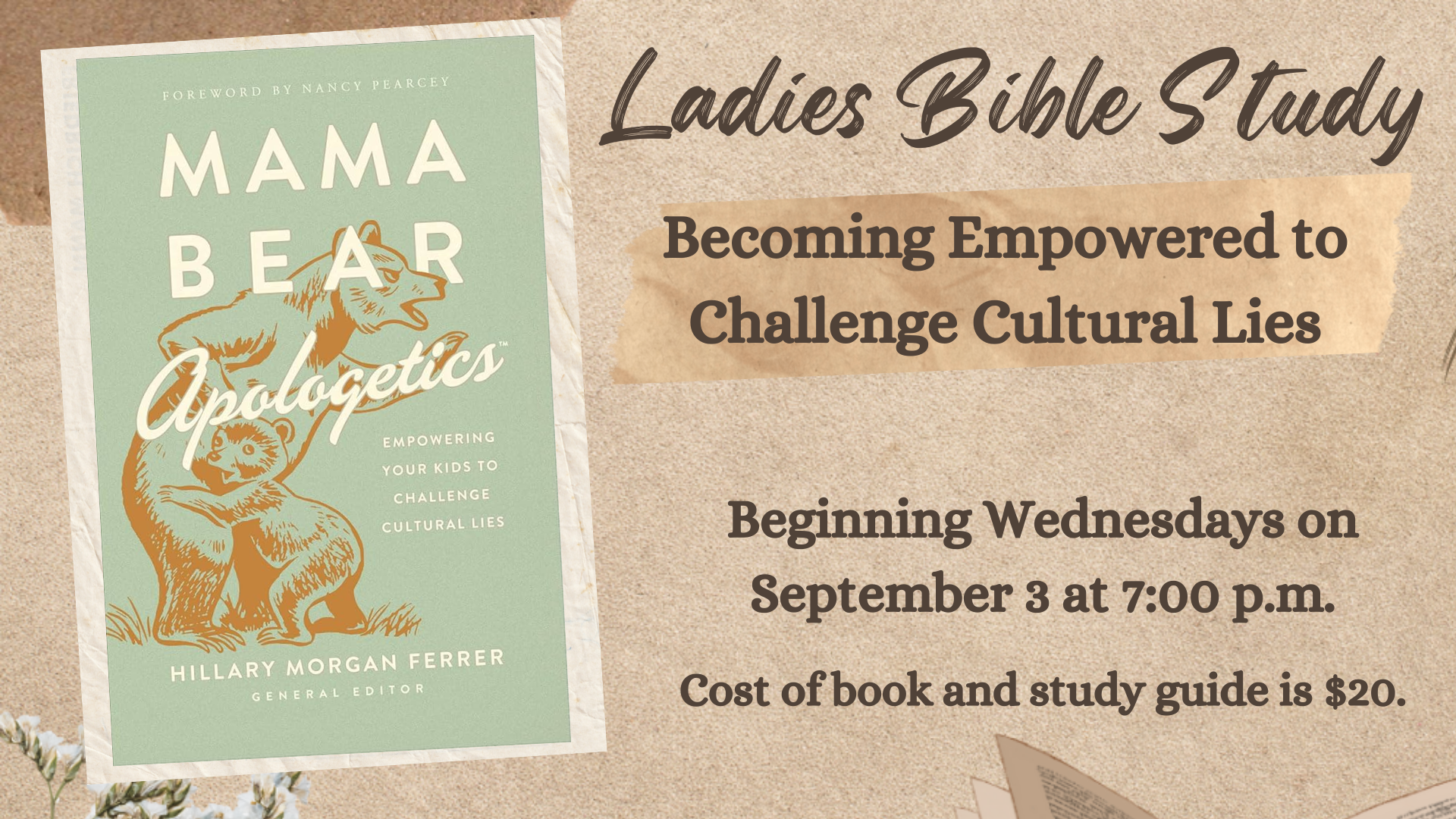 Each year, our ladies meet on Wednesday evenings during the regular worship service to engage in a special study to help us grow in the Lord together. All ladies regardless of their age or stage in life is invited to attend. This fall’s study, “Becoming Empowered to Challenge Cultural Lies,” will go from September 3 until November 17. We are studying Hillary Morgan Ferrer’s Mama Bear Apologetics. The book and study guide are optional but are available for $20. Click here to register.